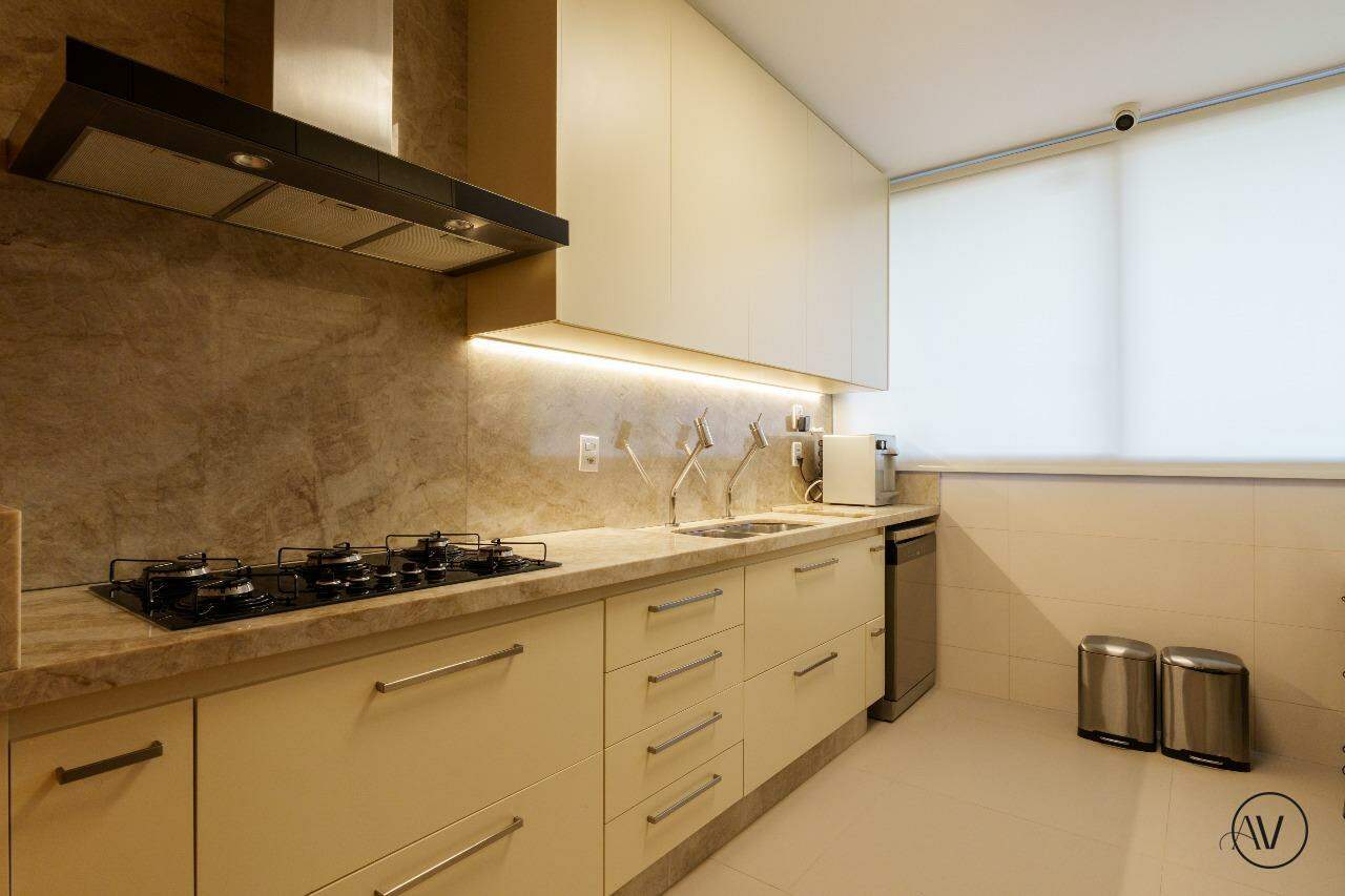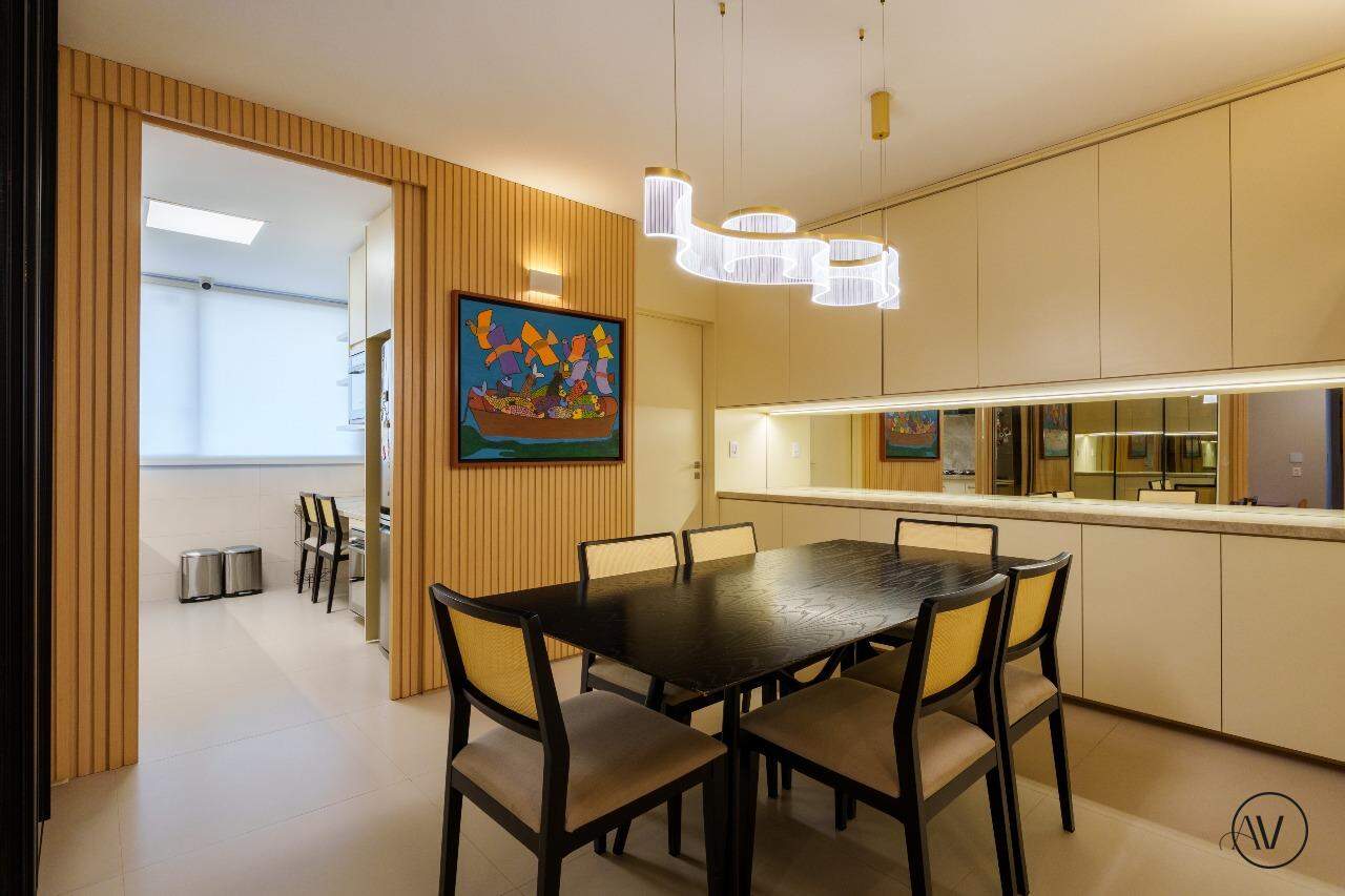 Os ambientes sociais foram concebidos para integrar elegância, amplitude e convivência, reunindo sala de estar, jantar e sala íntima em uma composição contínua e acolhedora. A área de apoio e a cozinha valorizam a praticidade do dia a dia, enquanto o projeto arquitetônico evidencia acabamentos refinados, marcenaria planejada e uma circulação inteligente entre os dois pisos, reforçando a sensação de residir em um espaço único e excepcional.