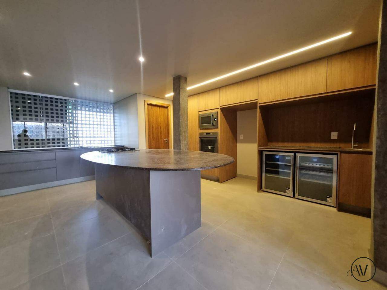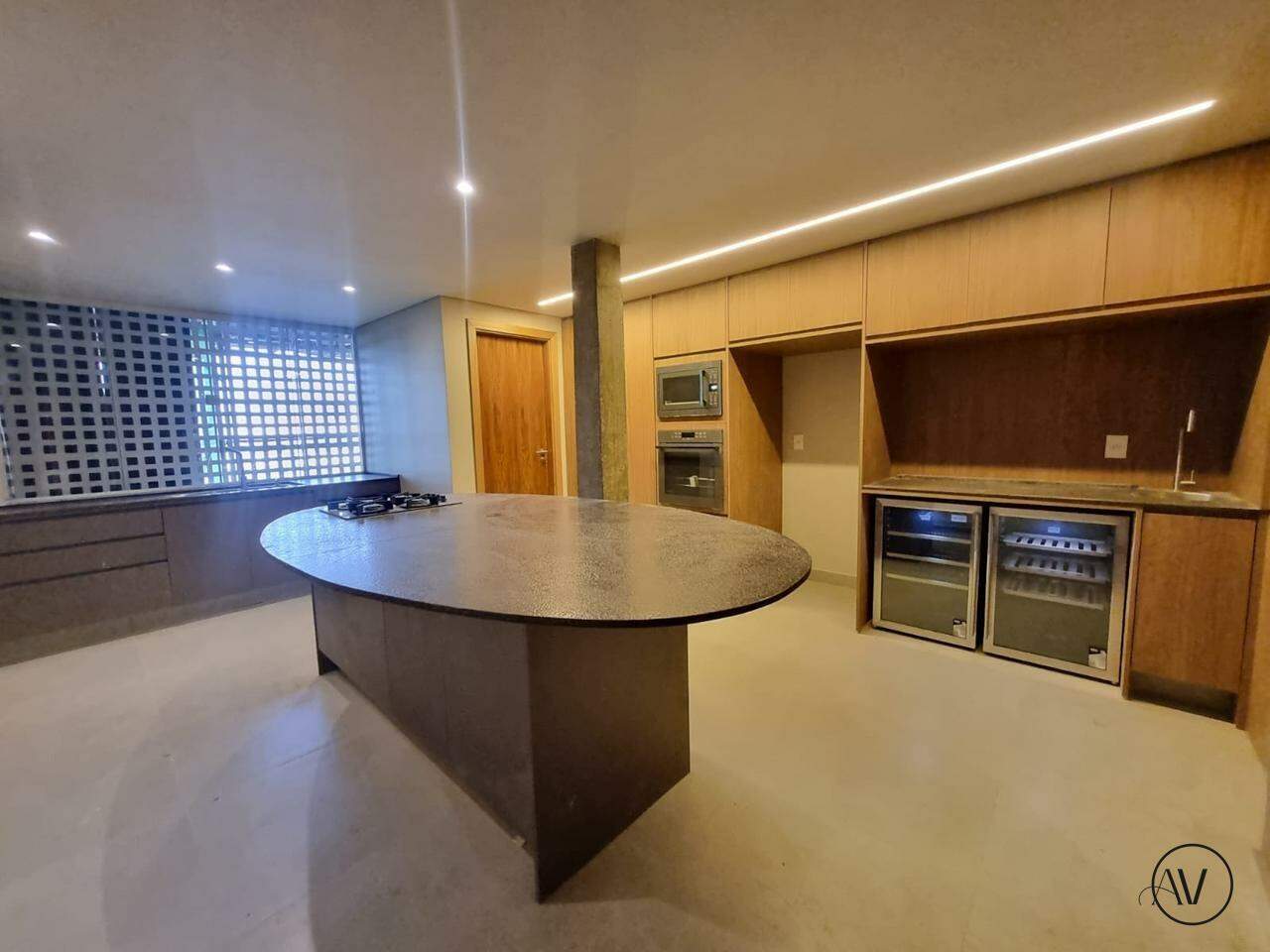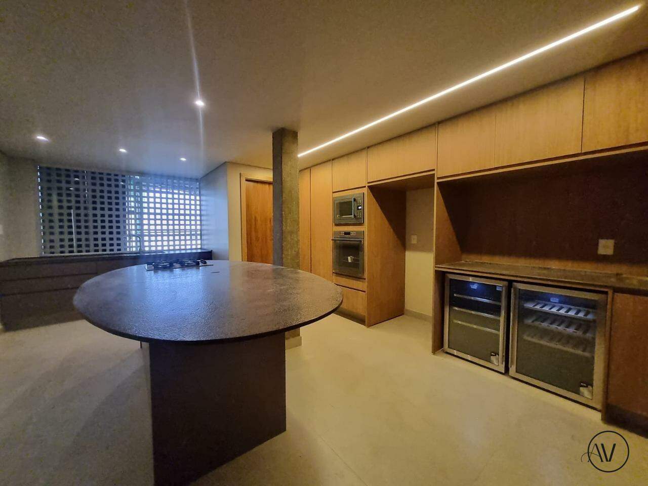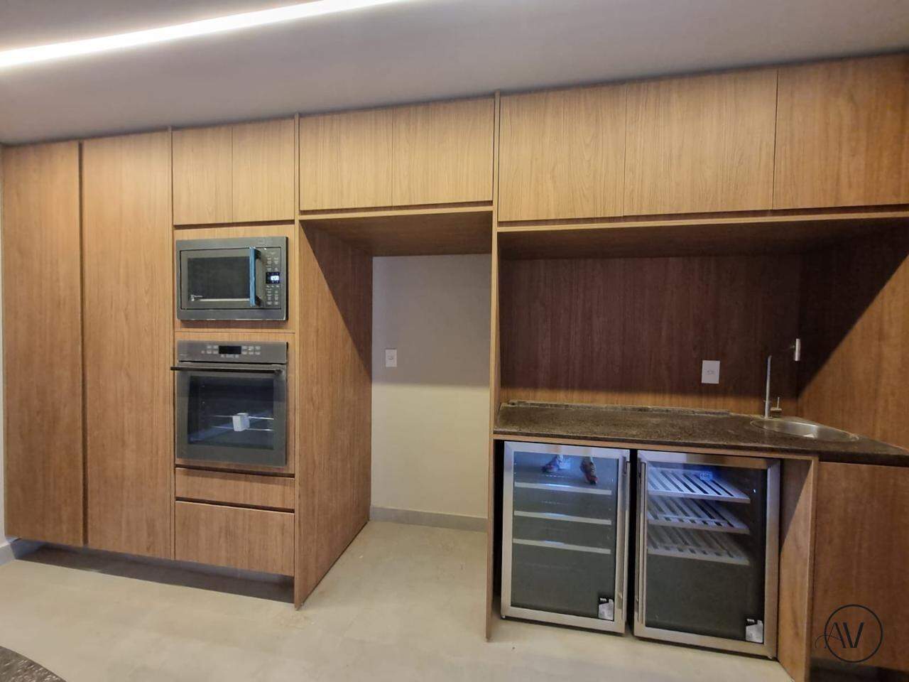 • Cozinha gourmet equipada com cooktop, forno elétrico, forno de micro-ondas, depurador de ar, lava-louças, adega, cervejeira e mesa oval central, além de ser bem servida de armários planejados