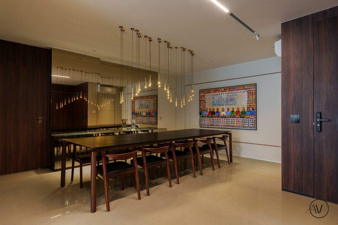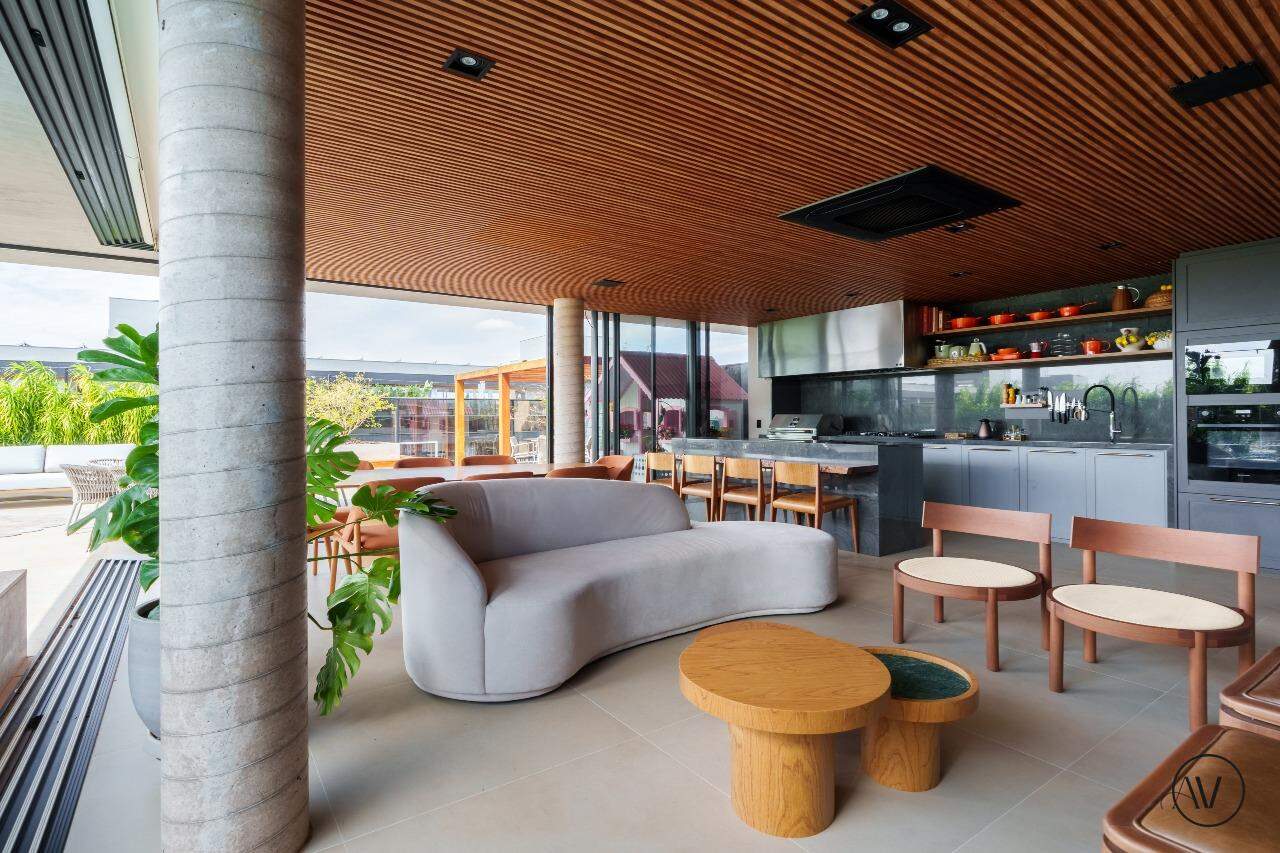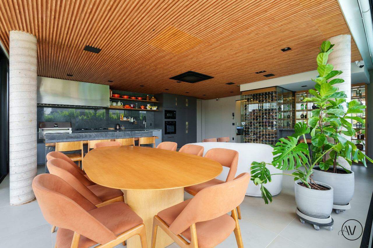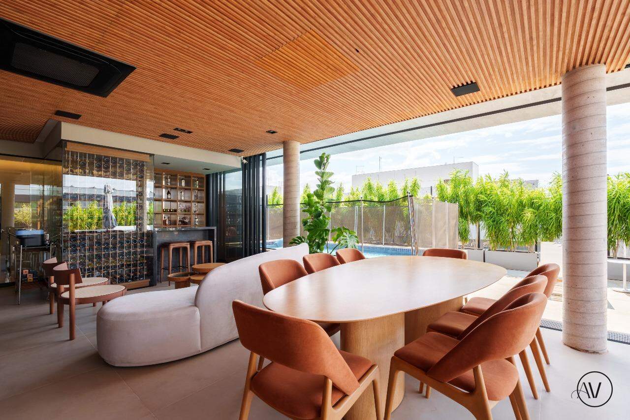 Os ambientes sociais foram concebidos para integrar elegância, amplitude e convivência, reunindo sala de estar, jantar e sala íntima em uma composição contínua e acolhedora. A área de apoio e a cozinha valorizam a praticidade do dia a dia, enquanto o projeto arquitetônico evidencia acabamentos refinados, marcenaria planejada e uma circulação inteligente entre os dois pisos, reforçando a sensação de residir em um espaço único e excepcional.