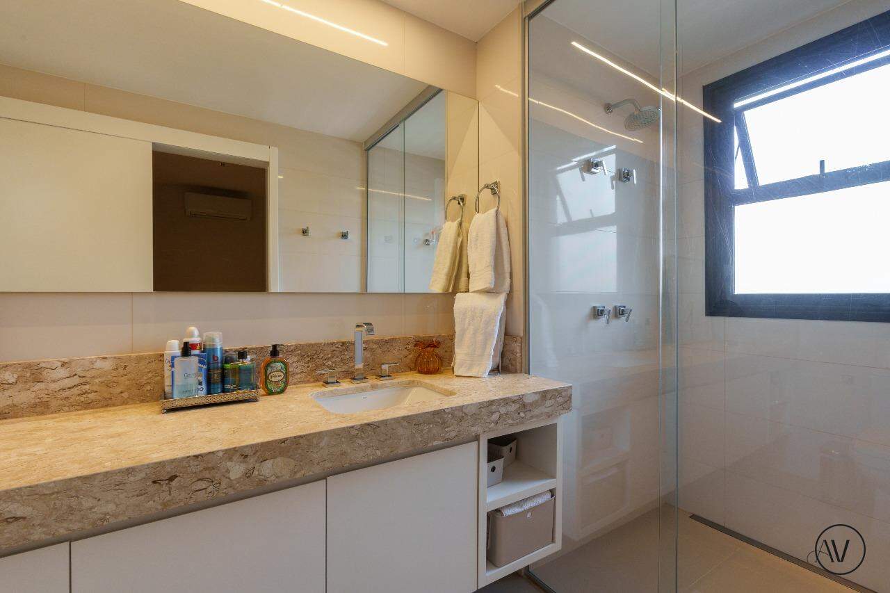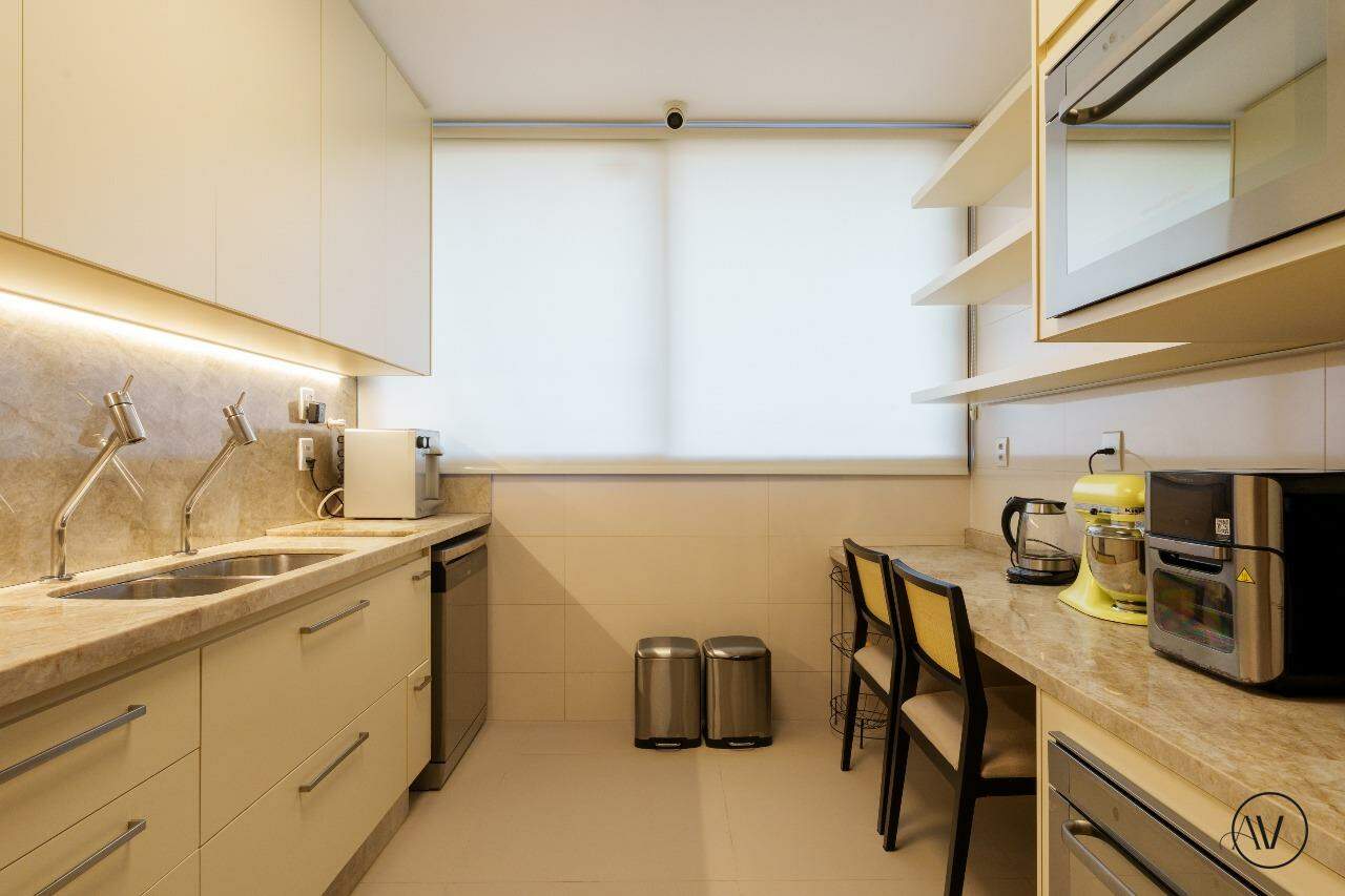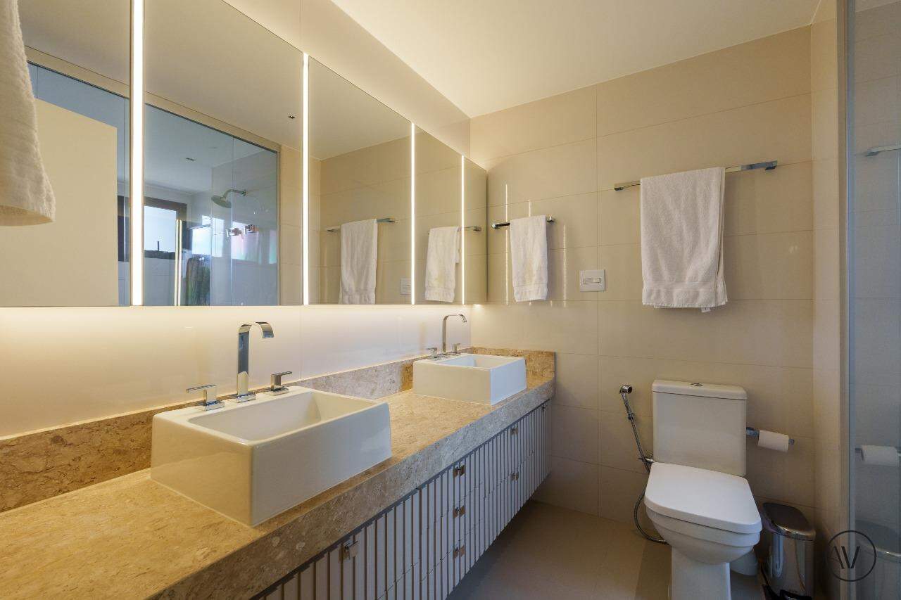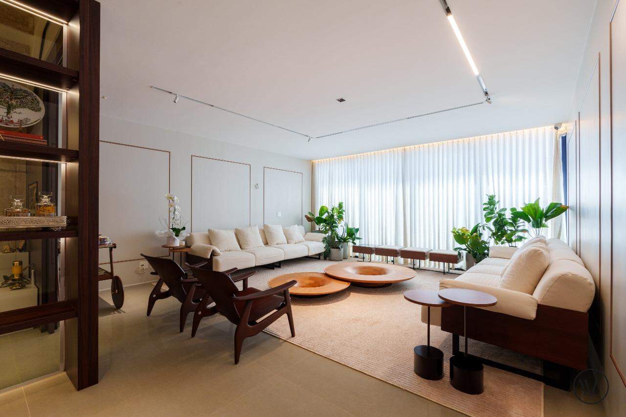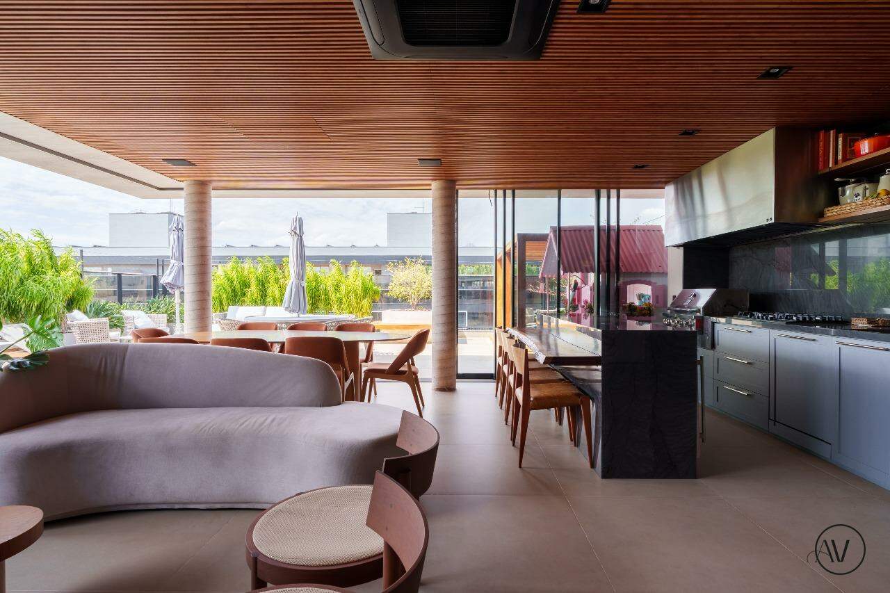 Os ambientes sociais foram concebidos para integrar elegância, amplitude e convivência, reunindo sala de estar, jantar e sala íntima em uma composição contínua e acolhedora. A área de apoio e a cozinha valorizam a praticidade do dia a dia, enquanto o projeto arquitetônico evidencia acabamentos refinados, marcenaria planejada e uma circulação inteligente entre os dois pisos, reforçando a sensação de residir em um espaço único e excepcional.