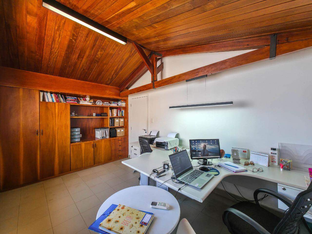 O mezanino abriga um quarto adicional, banheiro e um escritório, perfeito para quem busca um ambiente reservado e silencioso para trabalho ou estudos.
